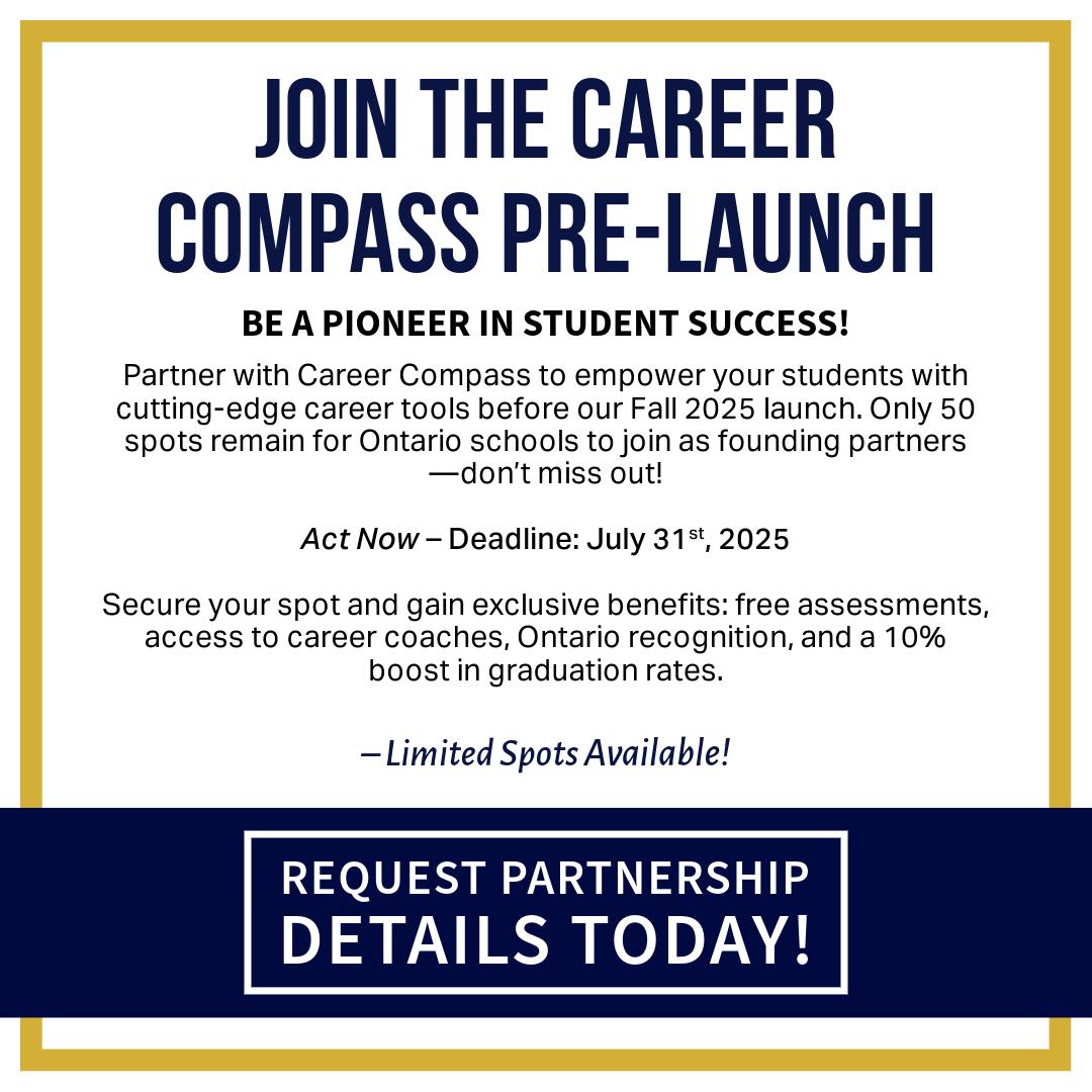 The Compass Network’s Career Compass is here to transform how your students navigate their career paths. Designed for schools and universities in Ontario, our platform offers personalized career tools, resources, and coaching to help students succeed in today’s competitive job market. By partnering with us, you can integrate Career Compass into your career services, giving your students access to free assessments, job-matching tools, and a vetted marketplace of professionals. Request our whitepaper to learn how we can tailor this program for your institution and inspire the next generation together!